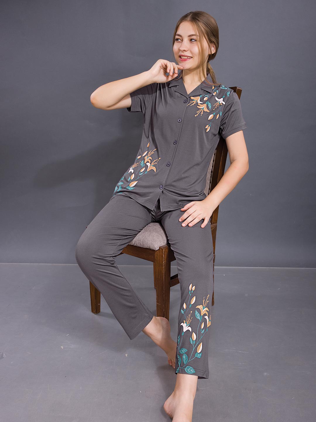 Woman wearing a gray pajama set with floral embroidery sitting on a chair against a gray background